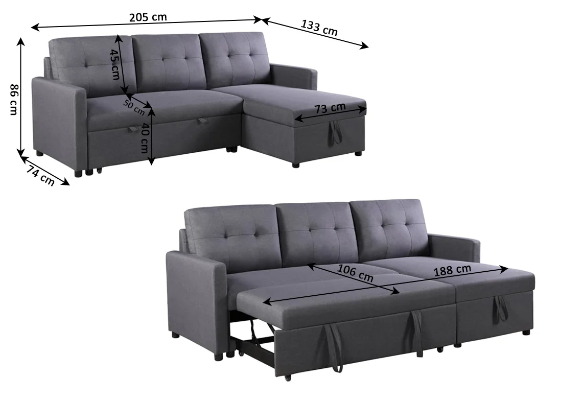 Entdecken Sie den ultimativen Komfort mit dem Kathe Chaiselongue Sofa – der perfekten Mischung aus Stil, Funktionalität und Gemütlichkeit. Dieses elegante Sofa mit Schlaffunktion verwandelt Ihr Wohnzimmer oder Schlafzimmer im Handumdrehen in eine luxuriöse Ruheoase. Mit einer großzügigen Länge von 205 cm und einer Breite von 74 cm bietet es nicht nur ausreichend Platz zum Entspannen, sondern wird durch die 133 cm breite Liegefläche zu einem gemütlichen Chaiselongue Schlafsofa für Gäste.