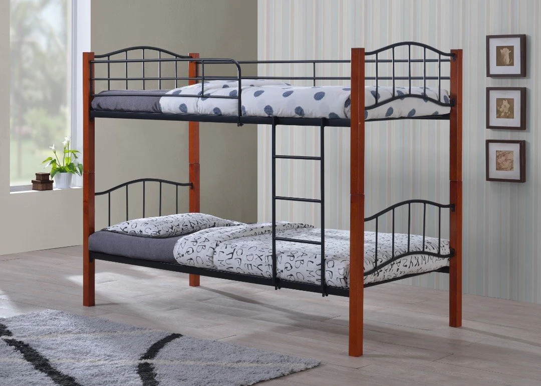 Dieses stilvolle Etagenbett vereint die Wärme von Holz mit der Stabilität von Metall und schafft so ein robustes Schlafmöbel für zwei Personen. Die durchdachte Materialkombination macht es nicht nur besonders widerstandsfähig, sondern lässt es auch harmonisch in unterschiedlichste Einrichtungsstile einfügen. Das Bett bietet optimalen Komfort und zuverlässige Stabilität für erholsame Nächte.